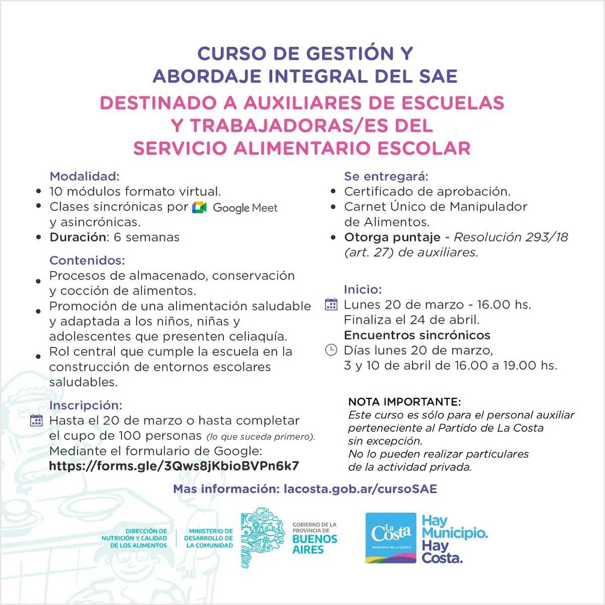 El Curso de Gestión y Abordaje Integral del Servicio Alimentario Escolar, organizado por la Municipalidad de La Costa está dirigido a la comunidad no docente de las escuelas del distrito, específicamente a los Auxiliares de Escuelas y Trabajadores del Servicio Alimentario Escolar –SAE-.