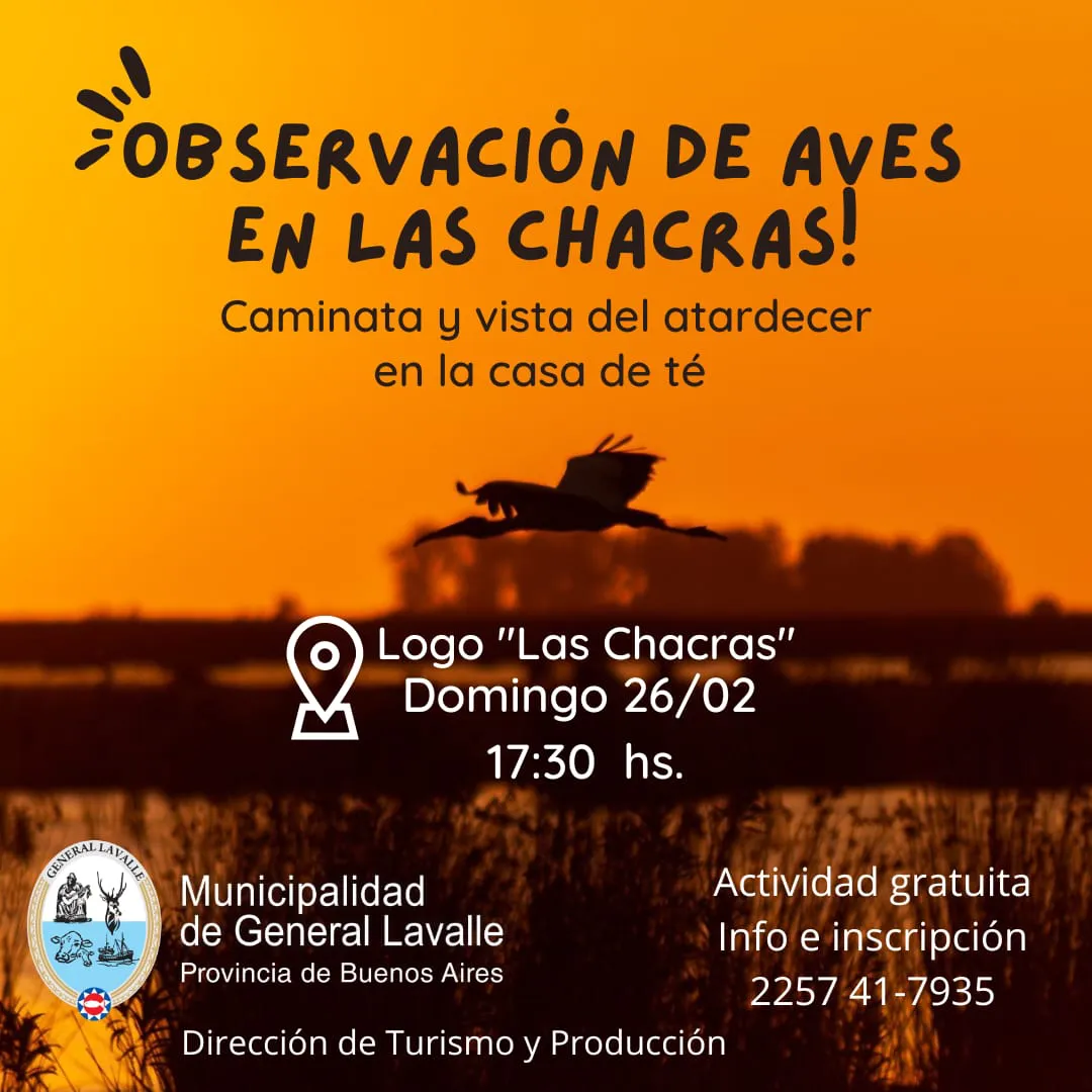 Desde la Dirección de Turismo y Producción de la Municipalidad de General Lavalle se invita a quienes estén dispuestos a pasar un atardecer en el campo, a realizar una Observación de Aves en el barrio conocido como Las Chacras.