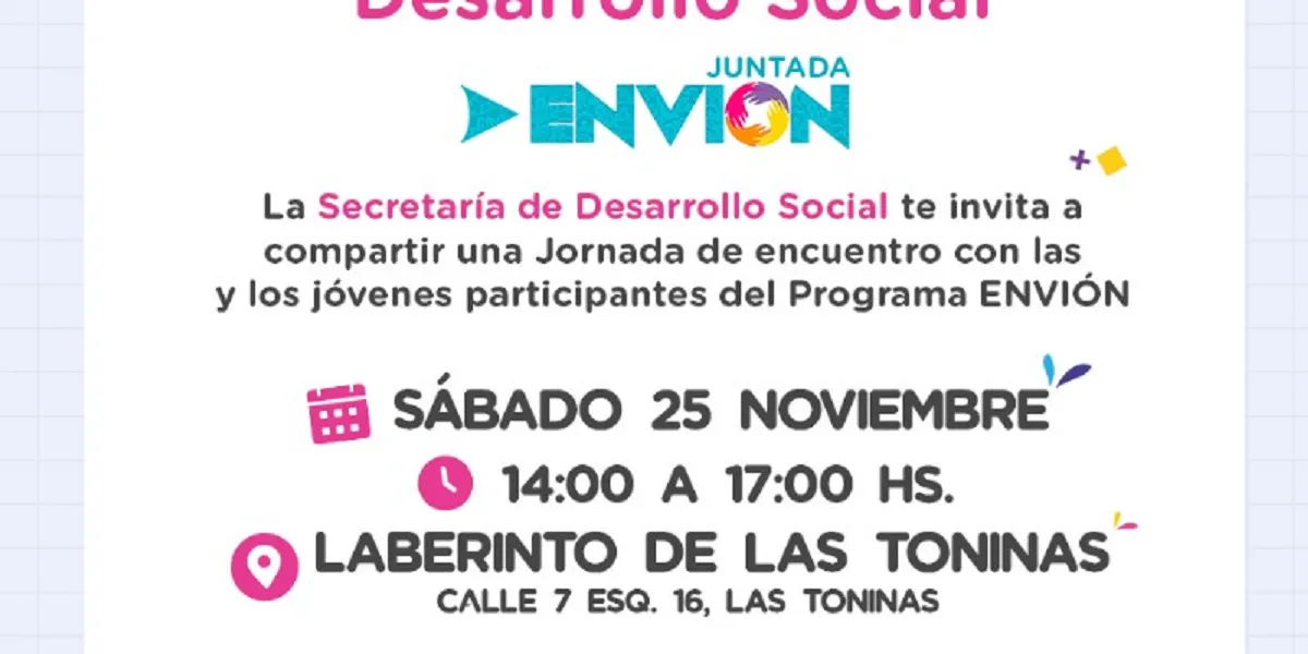 Este sábado 25 se llevará a cabo una jornada de encuentro con los jóvenes que participan del Programa Envión. Las actividades tendrán lugar de 14.00 a 17.00 en el Parque Temático Laberinto de Las Toninas, ubicado en Avenida 7 y calle 16. Este encuen