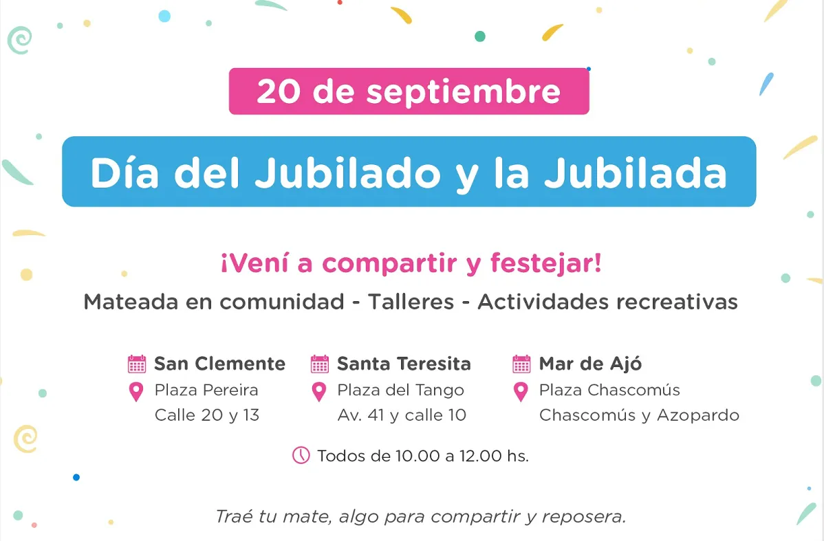 En La Costa se celebra a las adultas y adultos mayores con un sinfín de actividades. Entre las 10.00 a 12.00, habrá tres puntos de encuentro simultáneos: la Plaza Pereira en San Clemente (Calle 20 y 13), la Plaza del Tango en Santa Teresita (Av. 41 y Calle 10) y la Plaza Chascomús en Mar de Ajó (Chascomús y Azopardo). Además, En la Plaza del Tango de Santa Teresita se llevarán a cabo tareas de forestación a partir de las 13.00.
