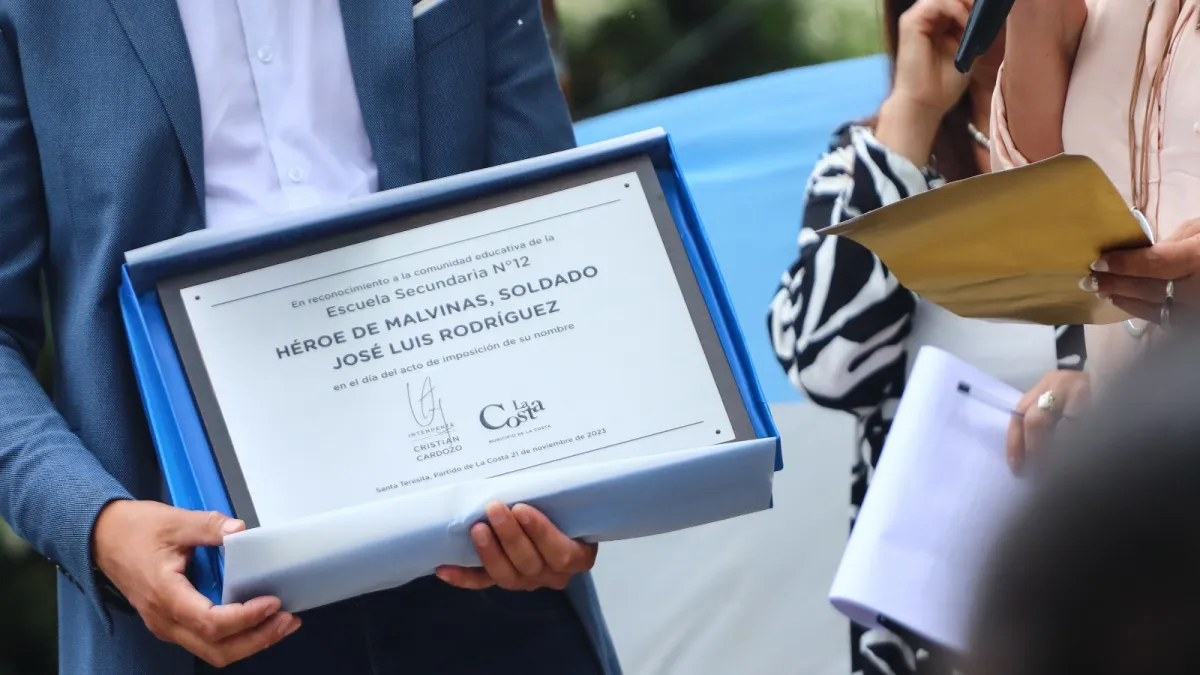 El intendente Cardozo entregó en nombre de la Municipalidad de La Costa una placa que quedará en la institución educativa, y se vivió un momento de mucha emoción cuando, junto a la directora de la Escuela Secundaria N° 12, le dieron al padre de José Luis Rodríguez una foto del ex combatiente que su padre firmó en el lugar y también quedará en la escuela para siempre.