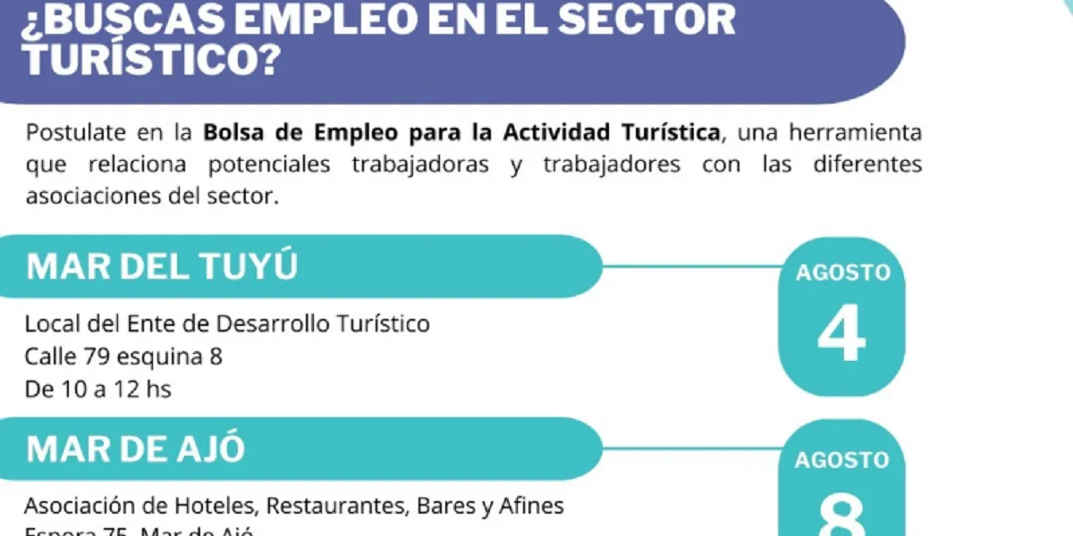 De 10.00 a 12.00, en la calle 4 N°2310, sede de la AHyG (Asociación Gastronómica y Hotelera) en San Clemente. A su vez, las y los interesados podrán acceder a las futuras capacitaciones que brinda el Edetur, como por ejemplo el curso de manipulación de alimentos y el curso de primeros auxilios, entre otras opciones. La Edición de la Bolsa de Empleo para la temporada anterior 2022/23 recibió las solicitudes de más de 350 postulantes, cuyos perfiles y CV estuvieron a disposición de hoteleros, gastronómicos, agencias de viaje, parques temáticos, balnearios, martilleros y demás prestadores de servicios que componen el Edetur a lo largo del distrito. Esta nueva convocatoria en las fechas citadas es exclusiva para quienes presentan sus CV por primera vez.