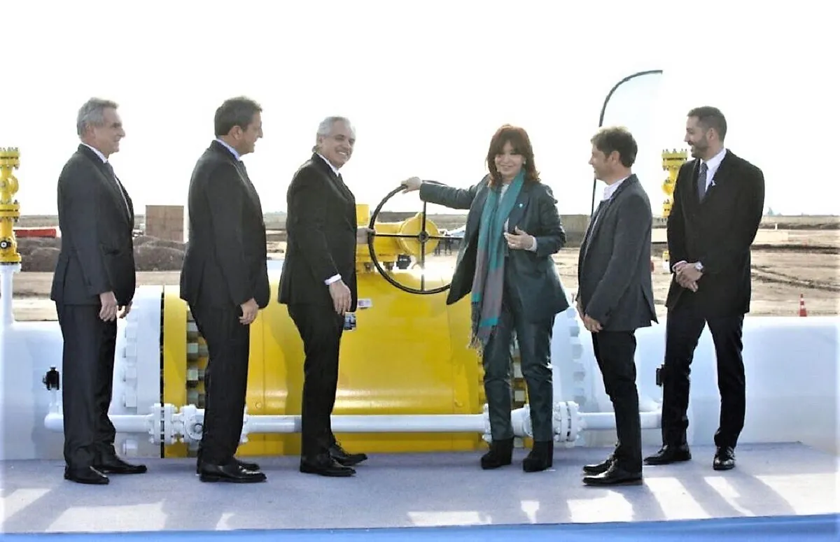 Los principales dirigentes de Unión por la Patria llegaron en helicópteros, de manera separada, y se juntaron para una foto en que Alberto Fernández y Cristina sostienen la válvula de apertura del último tramo del primer segmento construido del gasoducto, que llega desde Tratayén, en la provincia de Neuquén.