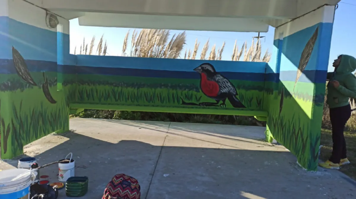 La jornada de muralismo se desarrolló en las garitas del ingreso al Paraje Pavón con el tópico del pastizal pampeano utilizando en su estética aves autóctonas.